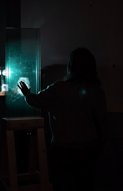 001 is an interactive installation which researches our behavior. Sensors are analyzing and monitoring the visitors' interaction with 001. This data is translated and used for communication with the visitor by real-time image and sound. Made for Cinedans at the EYE Museum Amsterdam 2020